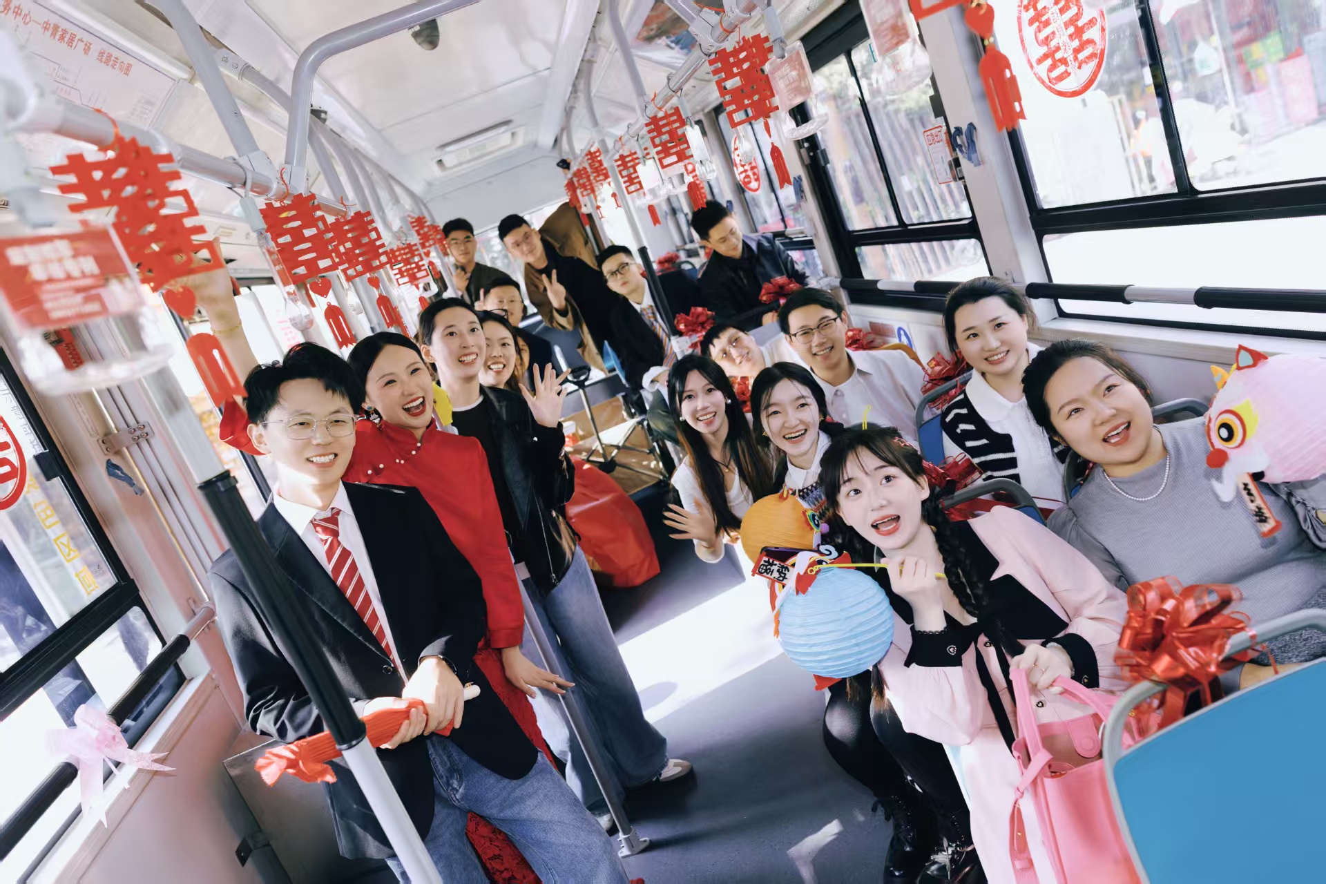 選擇公交婚車的簡約浪漫,如今已成為宿遷越來越多年輕人的共識(shí)。“傳統(tǒng)轎車接親不僅花費(fèi)高,親友們分散乘車還少了份熱鬧勁兒,大家擠在同一輛車?yán)锍?、合影,這種溫馨熱鬧的氛圍直‘拉滿’,往后回憶起來全是甜蜜”。這趟流動(dòng)的“幸福專線”讓城市街頭也彌漫起濃濃的喜慶氣息。
