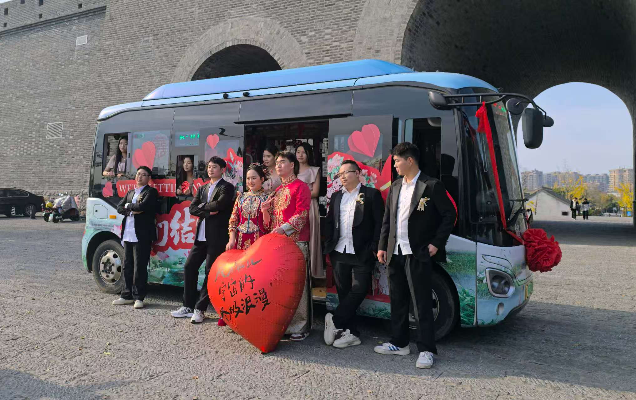 公交婚車的走俏,離不開背后完善的服務(wù)支撐與精準(zhǔn)的政策引導(dǎo)。為滿足新人的個(gè)性化需求,公交公司專門推出定制服務(wù):新人可根據(jù)賓客數(shù)量靈活選擇“酒都小巴”或公交大巴,還能自主設(shè)計(jì)車內(nèi)裝飾、規(guī)劃專屬接親路線,串聯(lián)起城市里的愛情地標(biāo),打造獨(dú)屬于自己的婚禮記憶。公司相關(guān)負(fù)責(zé)人表示:“今年,已有近50對(duì)新人選用新能源公交車作為婚車,公交婚車已然成為宿遷年輕人的婚嫁新時(shí)尚。”這股文明新風(fēng)尚,正持續(xù)升溫。