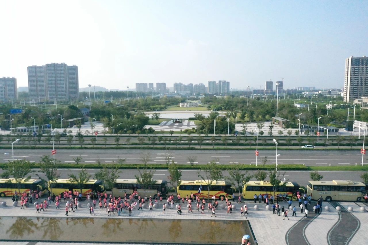 在這里,18輛由宿遷交通集團統(tǒng)籌調(diào)度的定制公交早已整裝待發(fā),志愿者們手持車輛編號牌在車旁引導(dǎo)。